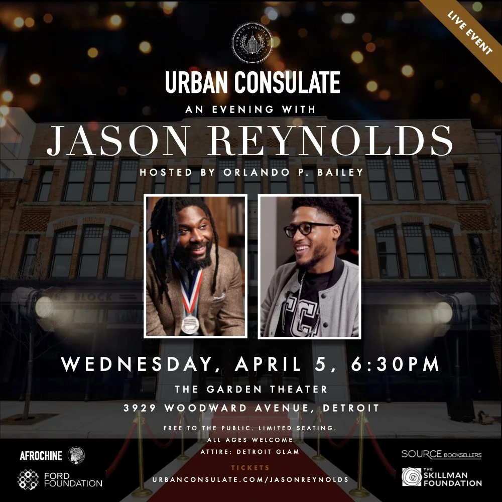 Detroit, MI — Inspired by his brilliance as a writer, poet, storyteller, teacher and lover of learning, Urban Consulate is honored to welcome #1 New York Times bestselling author Jason Reynolds to Detroit for a conversation with host Orlando P. Bailey to celebrate the power of Black wisdom, imagination and expertise in building more just and equitable communities.